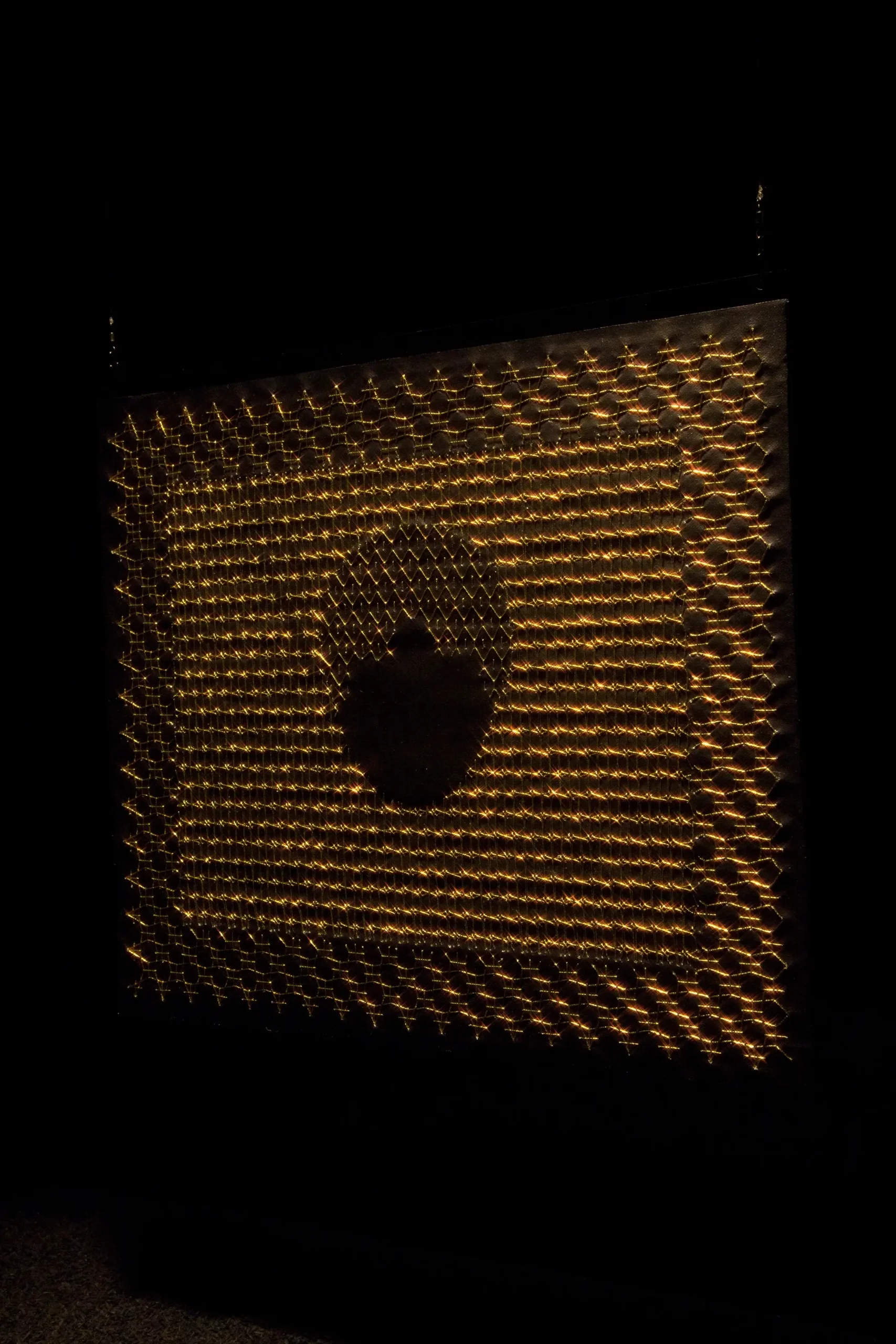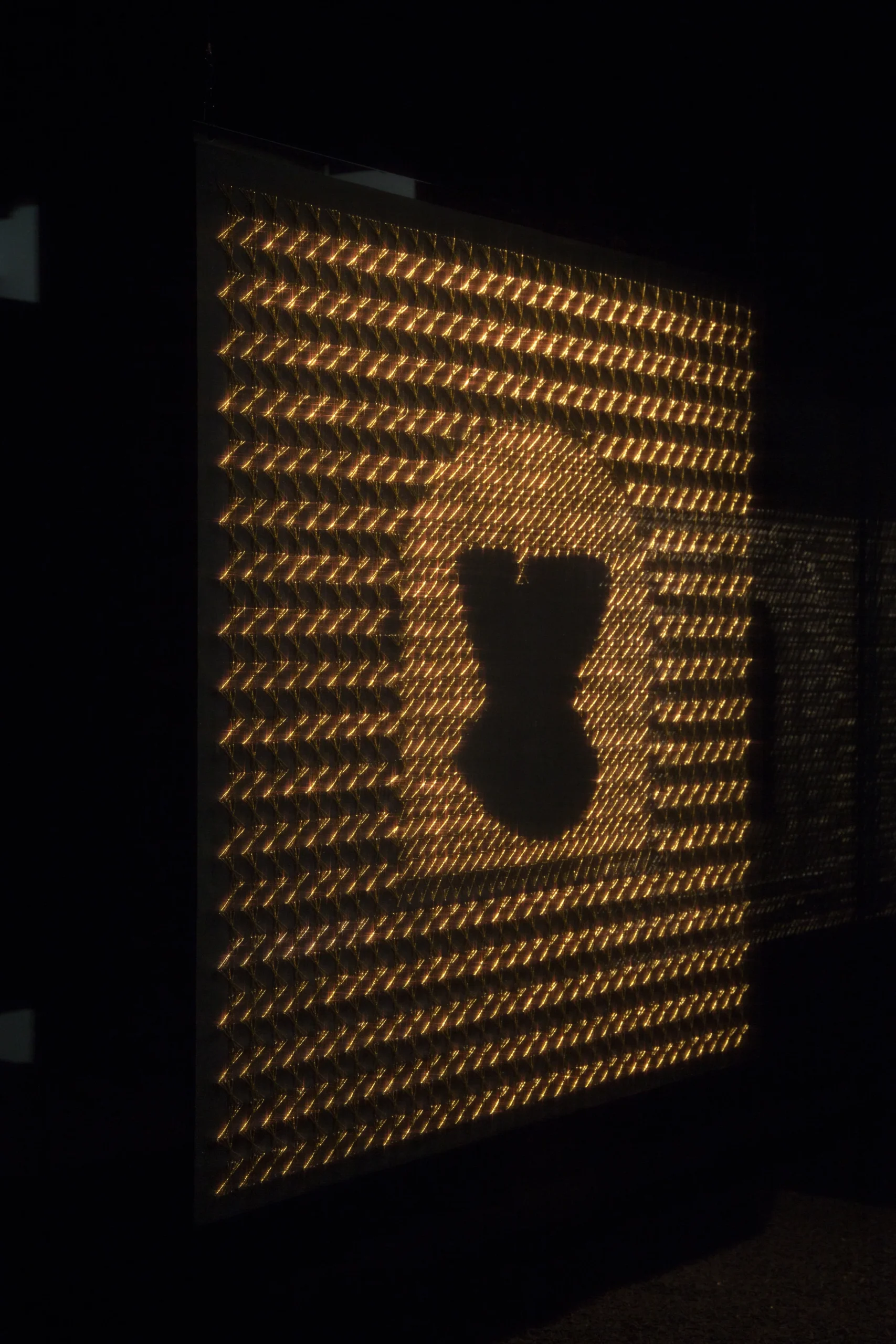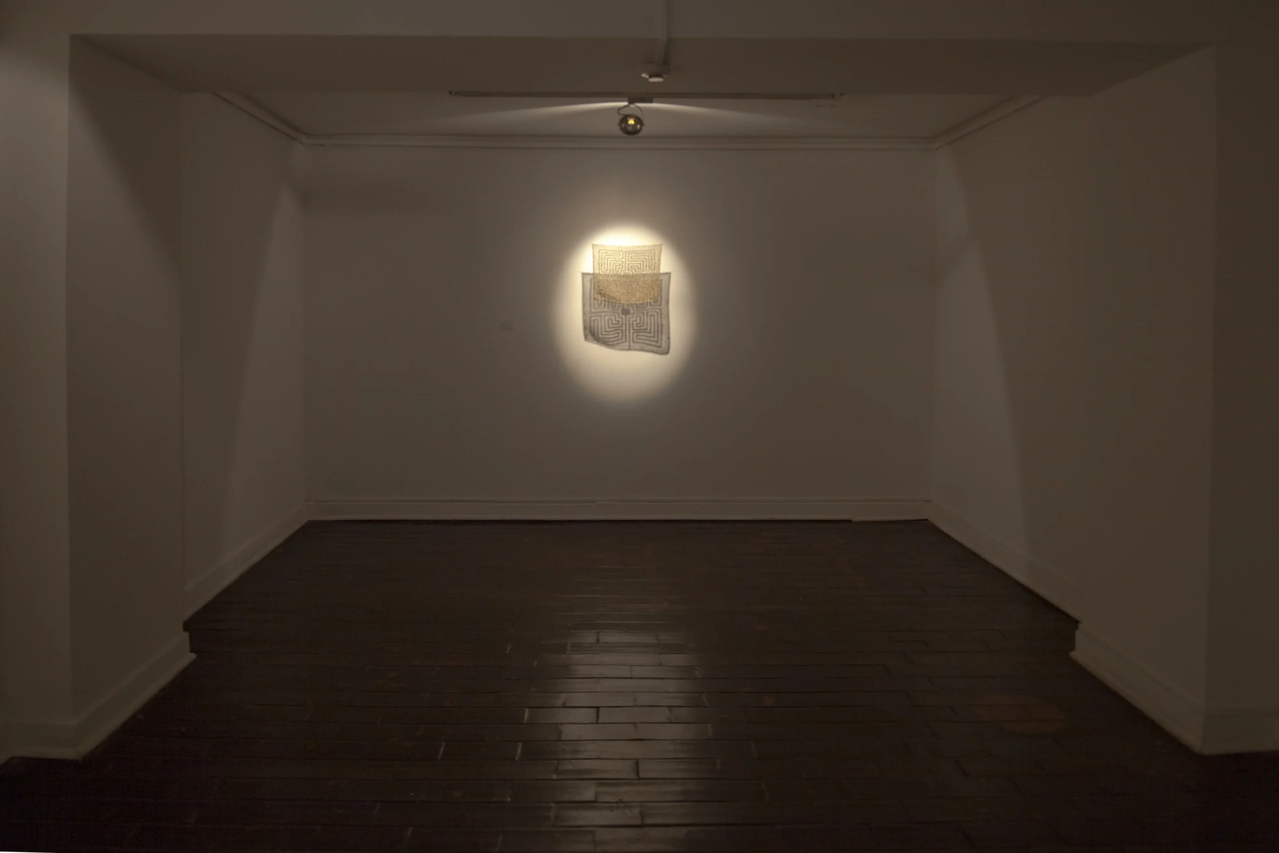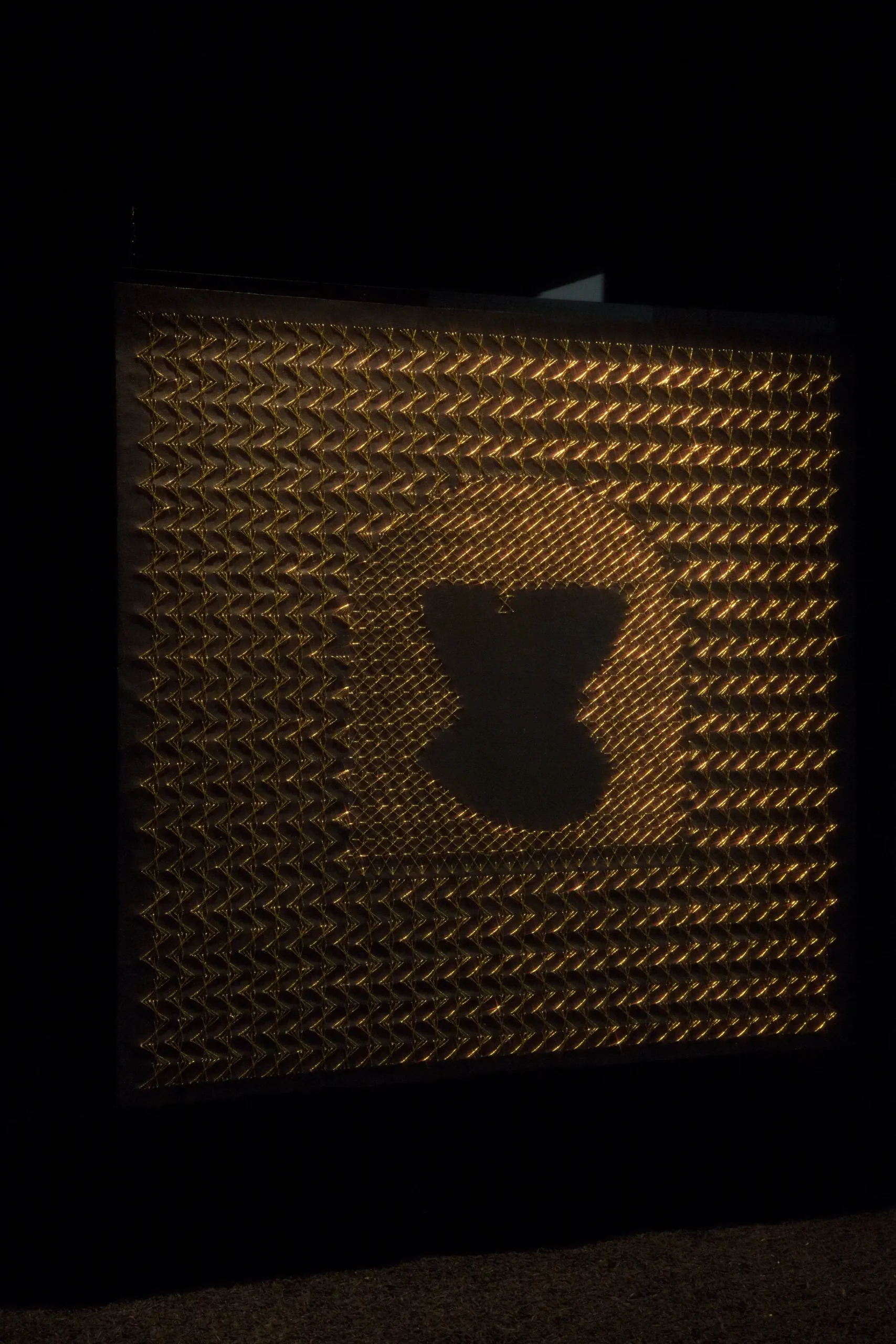 Aurora Anita develops an investigation around embroidery techniques, through which she identifies new patterns derived from the decorative elements that accompany various religious icons. Within them, the silhouette becomes immersed in abstract forms that intensify the represented image. In this way, she works with the negative through different stitches and threads, bringing to life a crucial—yet often invisible—dimension in the history of Latin American women.