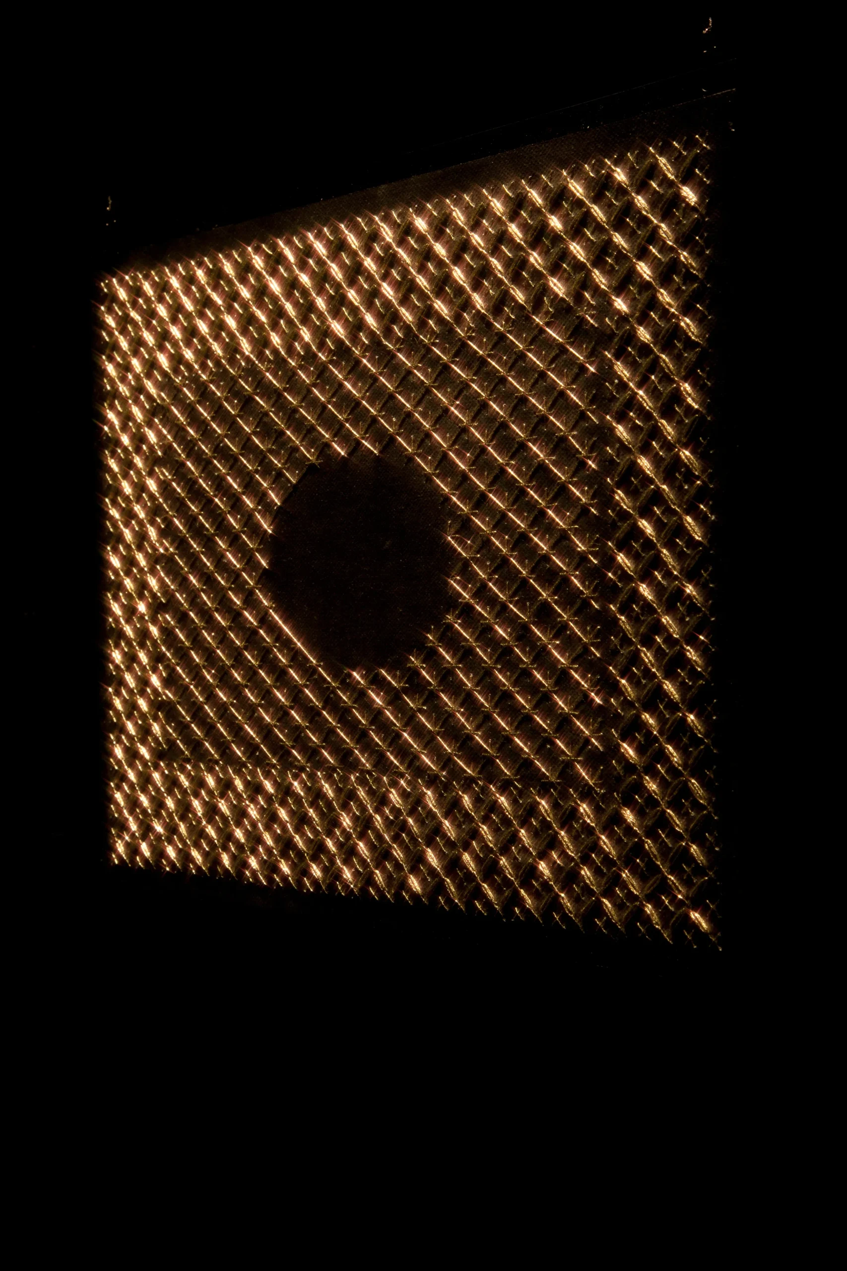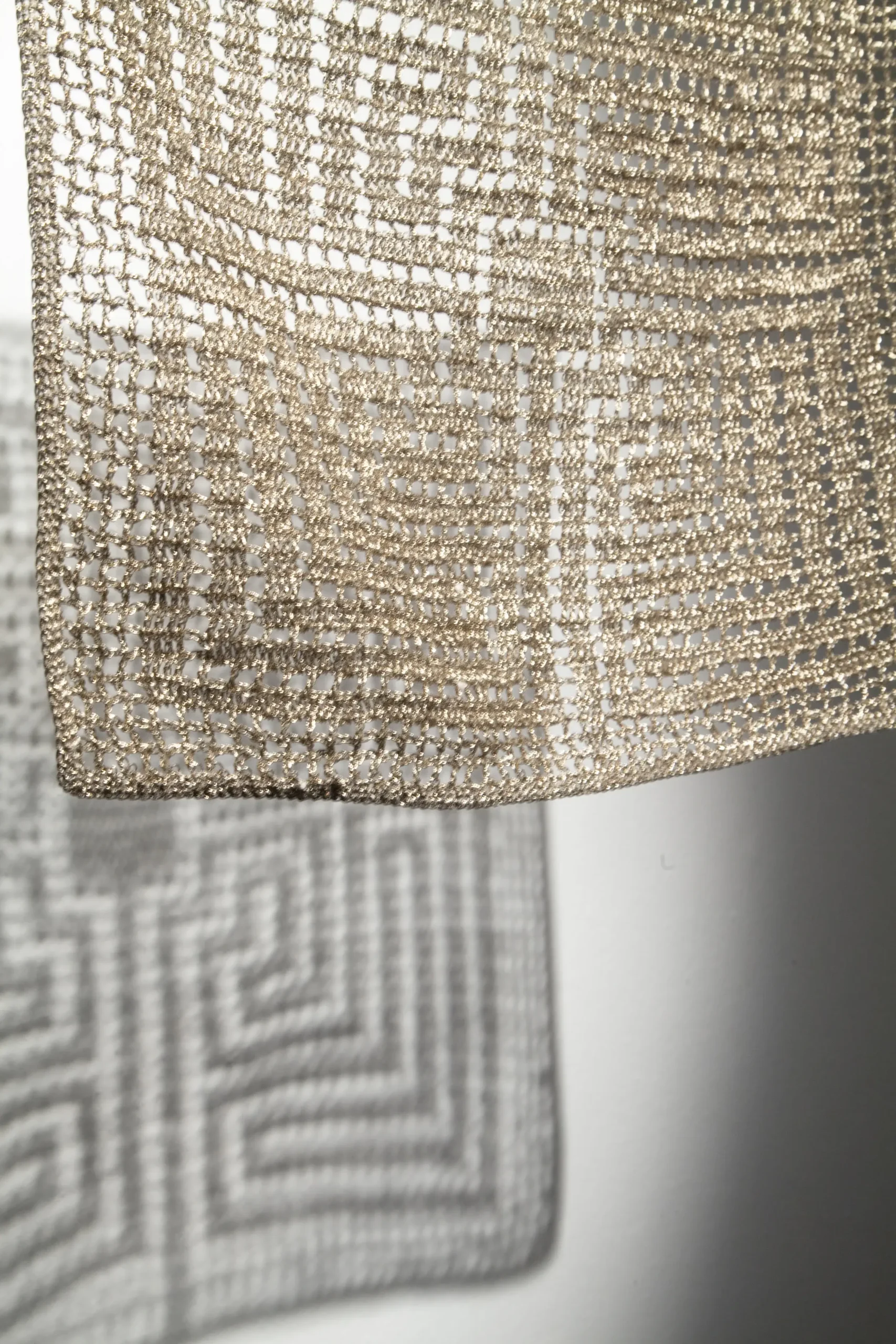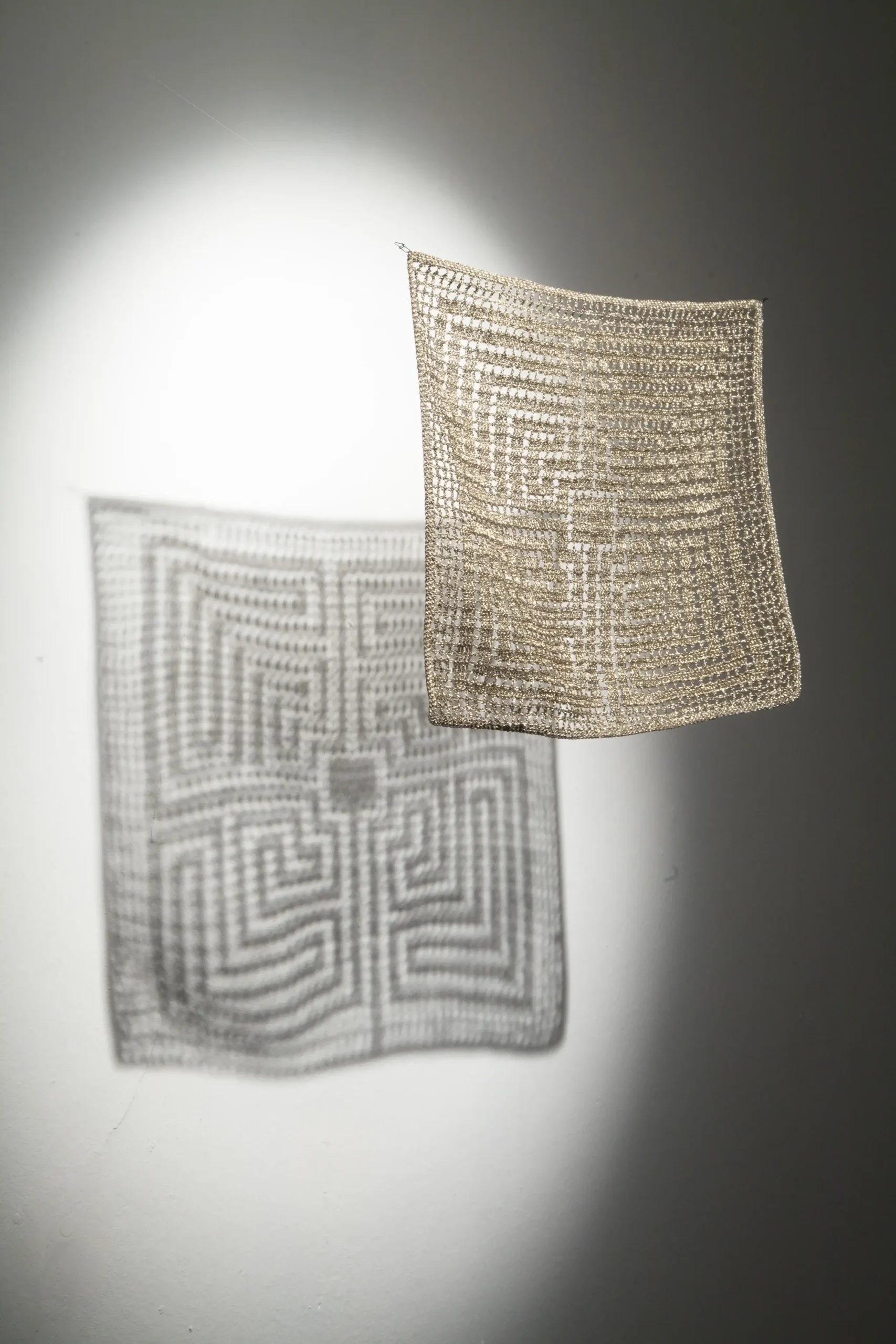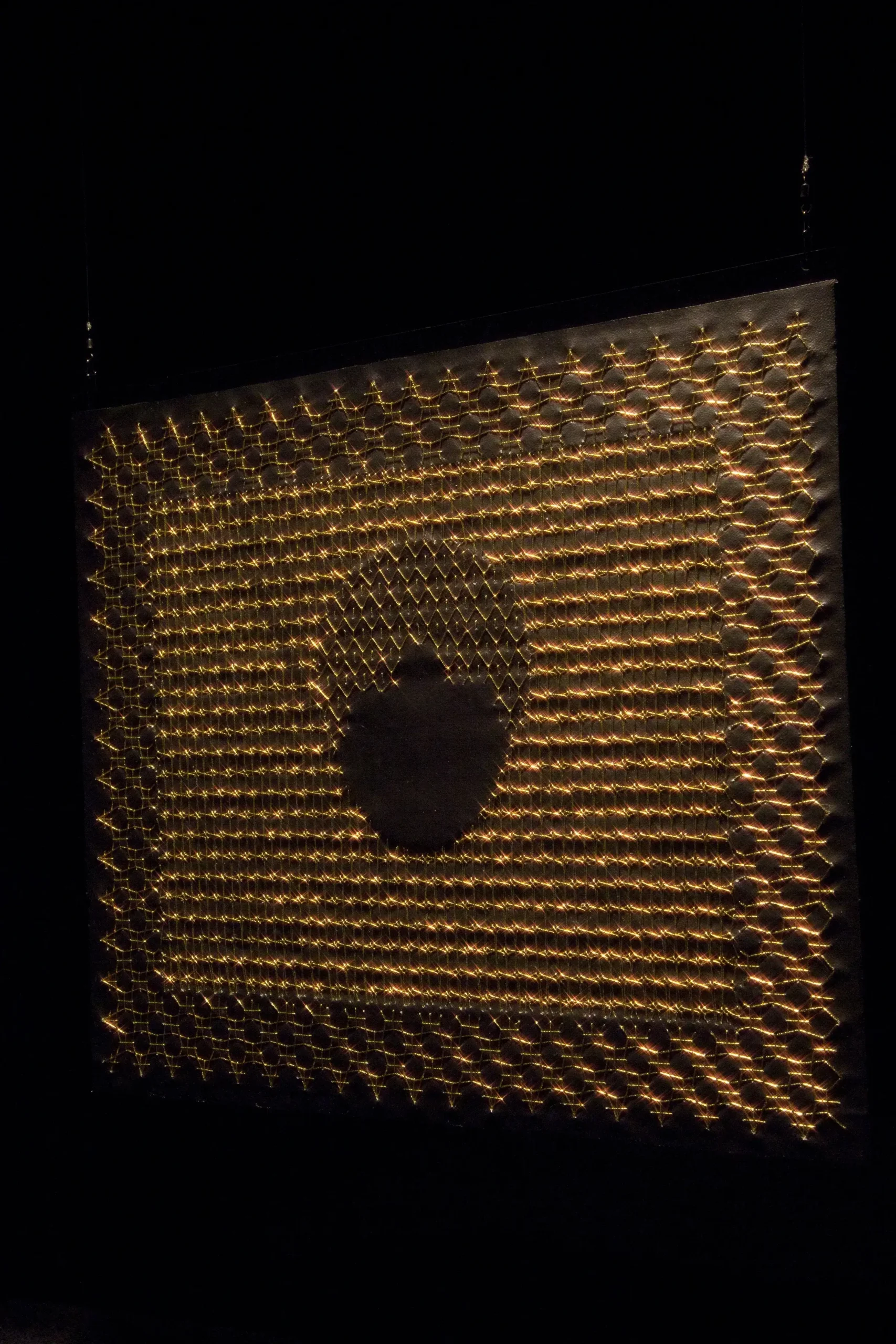 Aurora Anita develops an investigation around embroidery techniques, through which she identifies new patterns derived from the decorative elements that accompany various religious icons. Within them, the silhouette becomes immersed in abstract forms that intensify the represented image. In this way, she works with the negative through different stitches and threads, bringing to life a crucial—yet often invisible—dimension in the history of Latin American women.