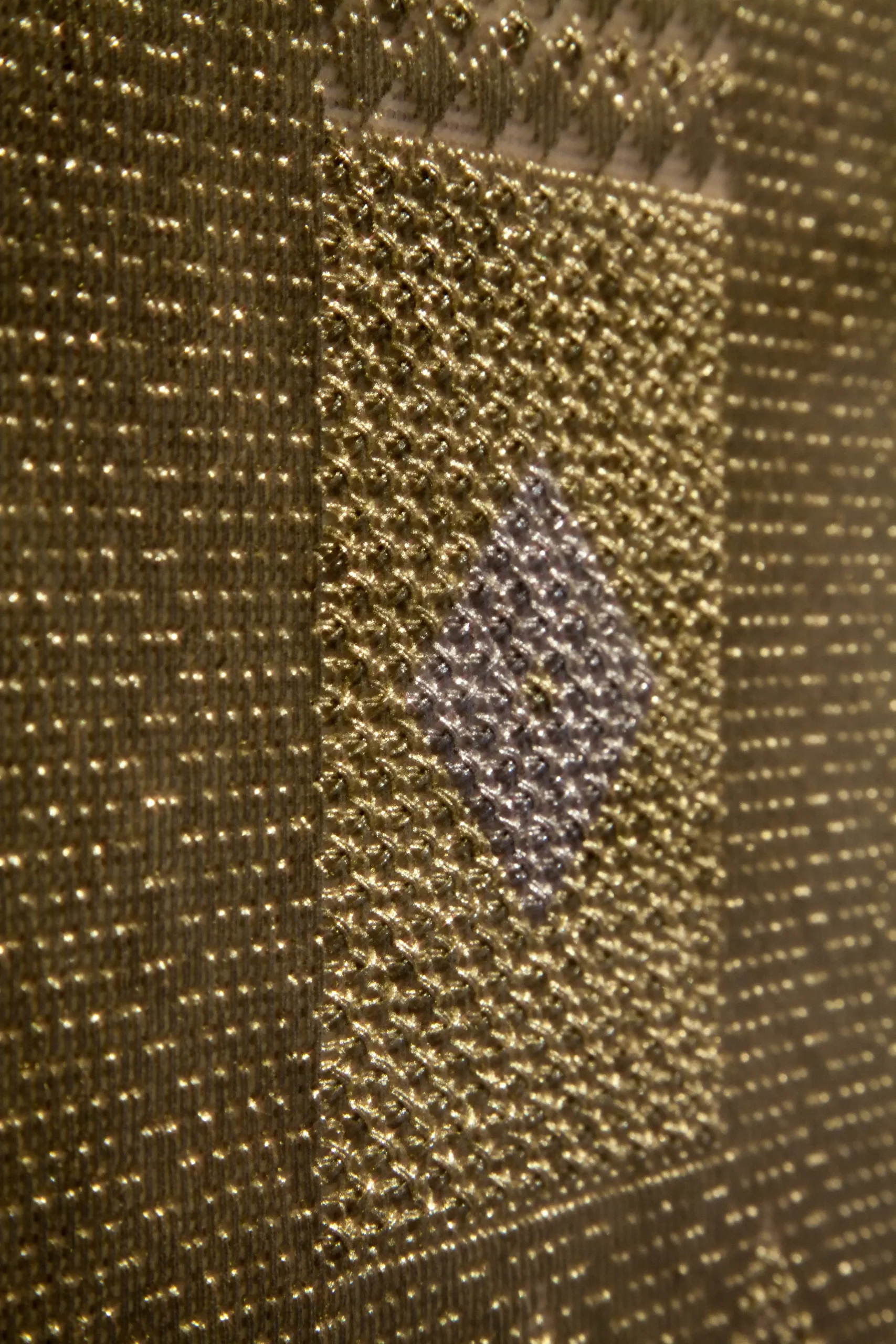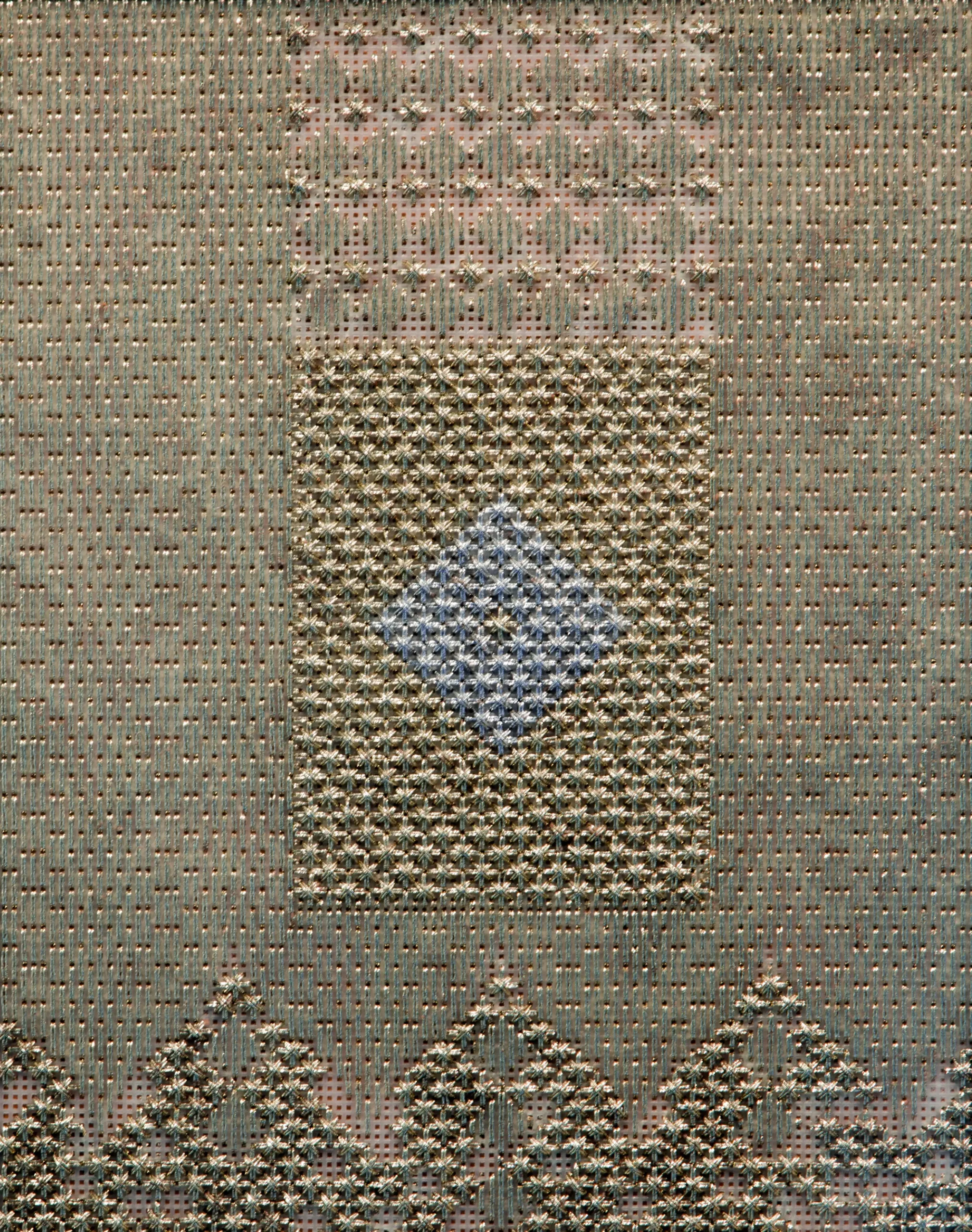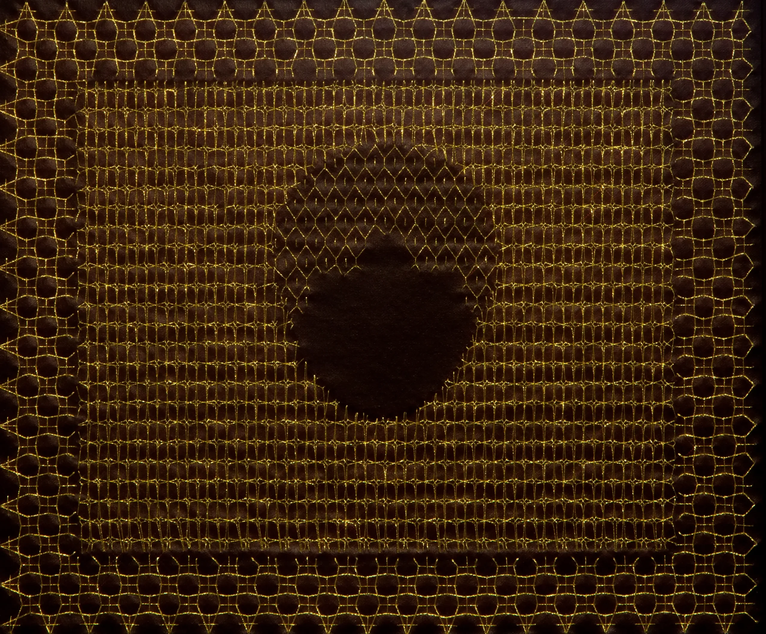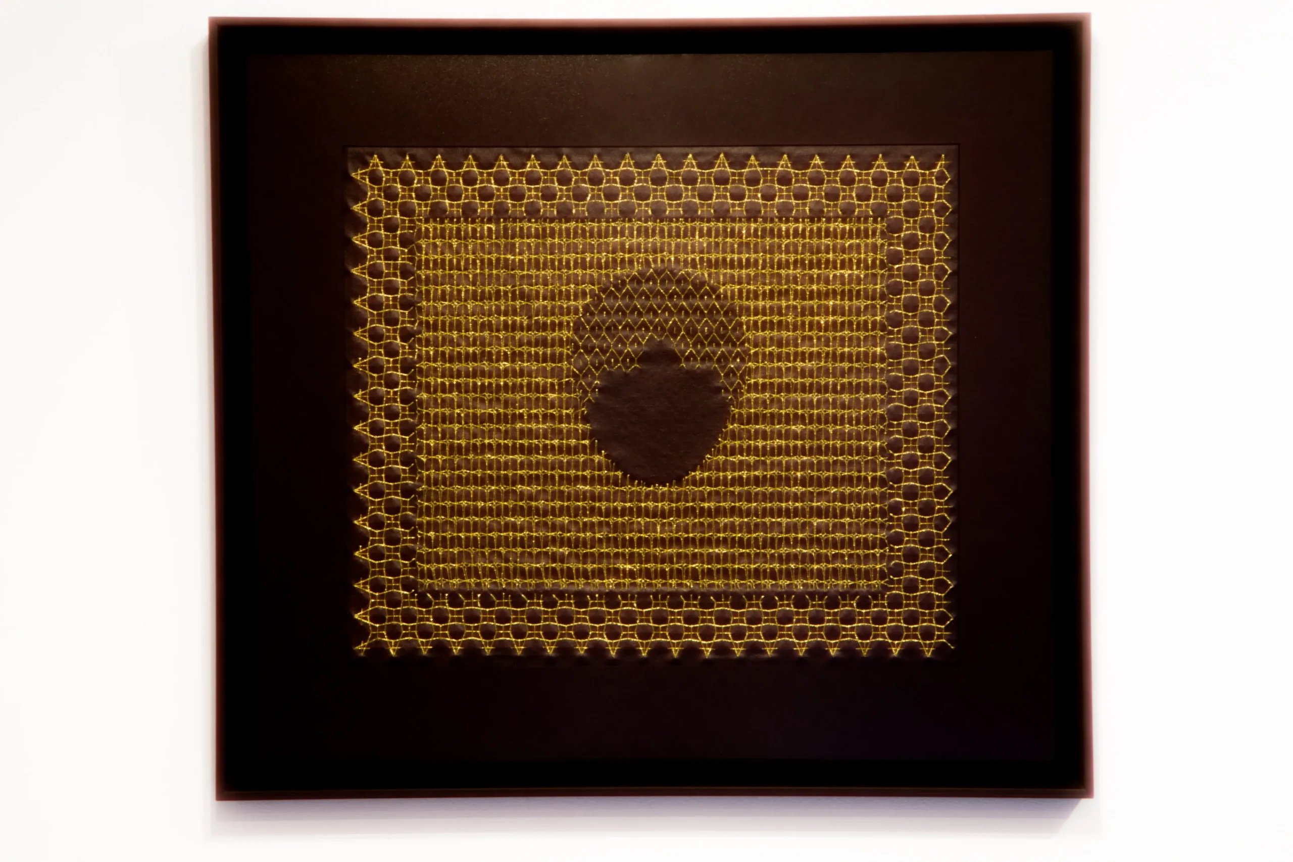 In an initial phase, Aurora used goldwork embroidery and golden threads to highlight period garments through the negative. The silhouettes of these garments were portrayed by the artist to question what were understood as “good customs,” through clothing that sought to constrain and reflect socially accepted values. In the current exhibition, delving deeper into the same theme, she moves away from figuration to give way to patterns.