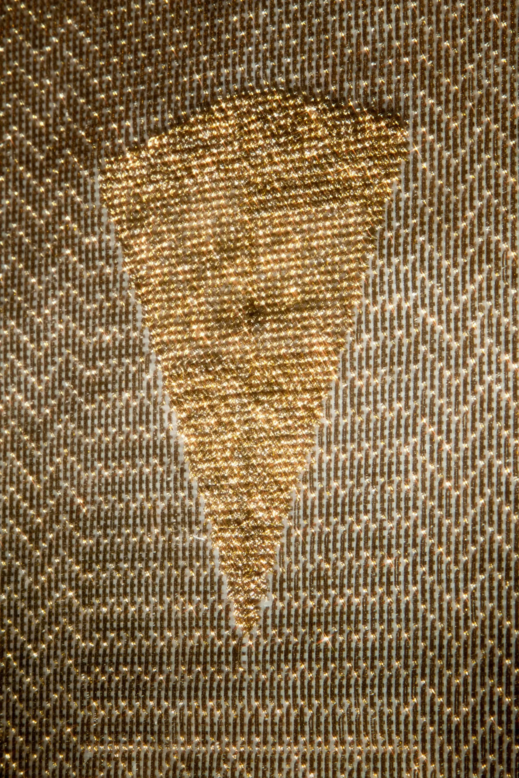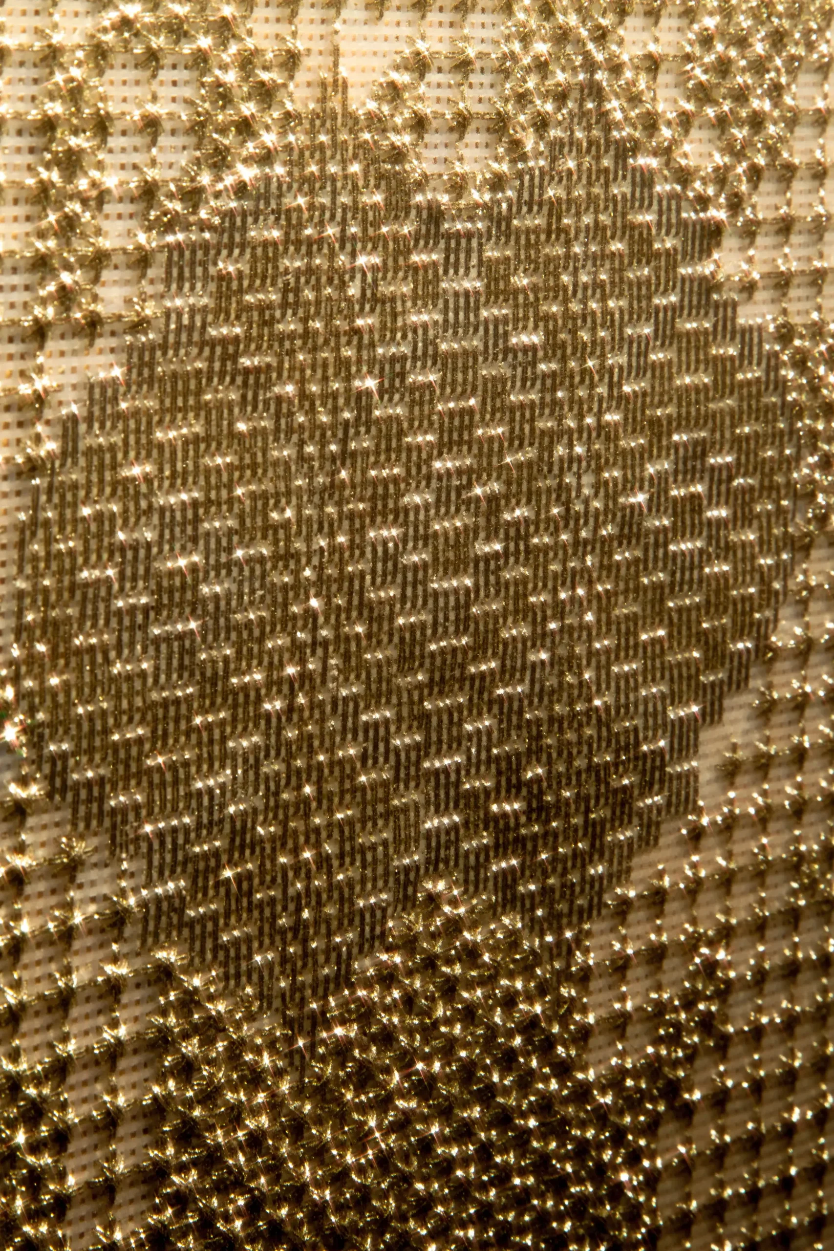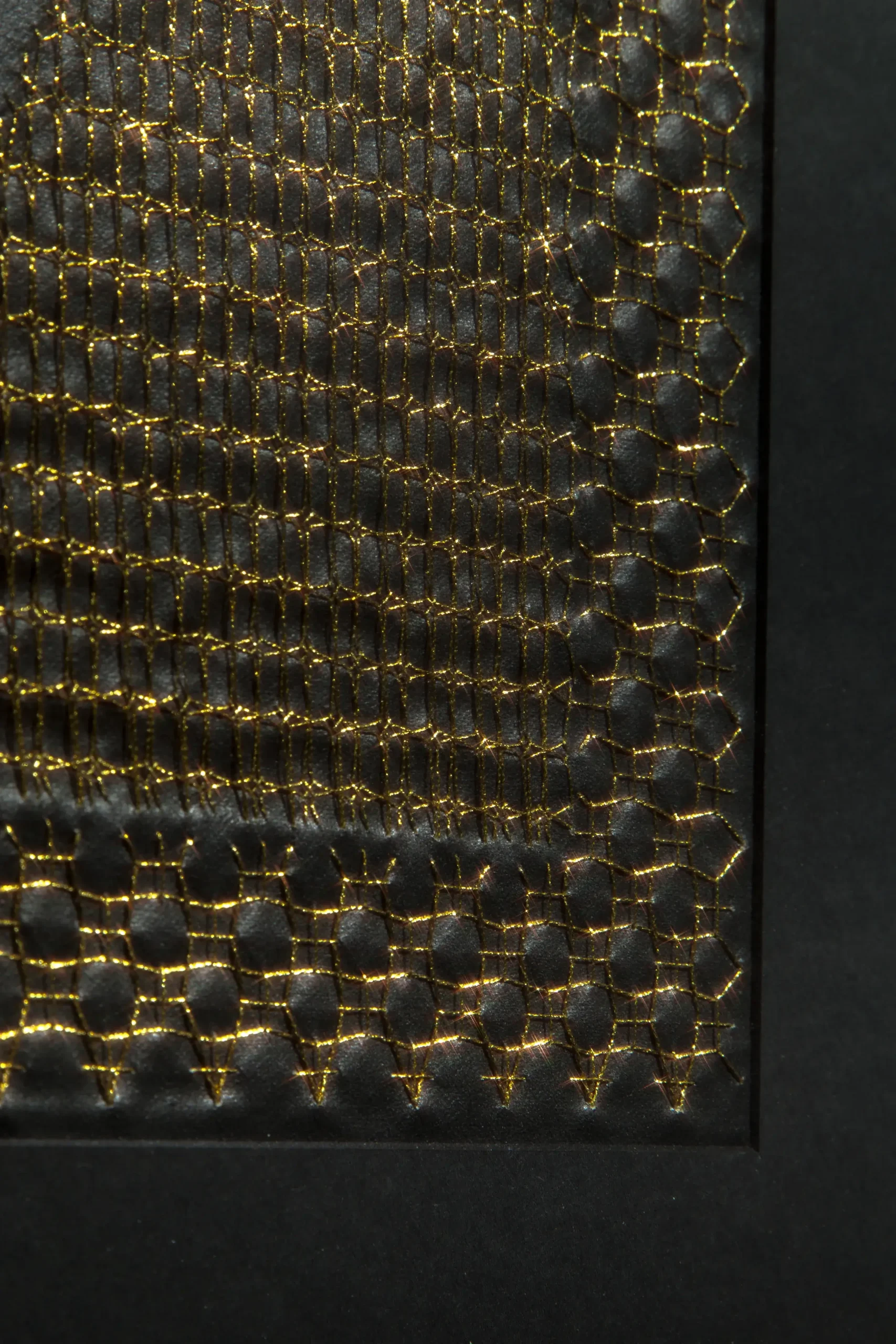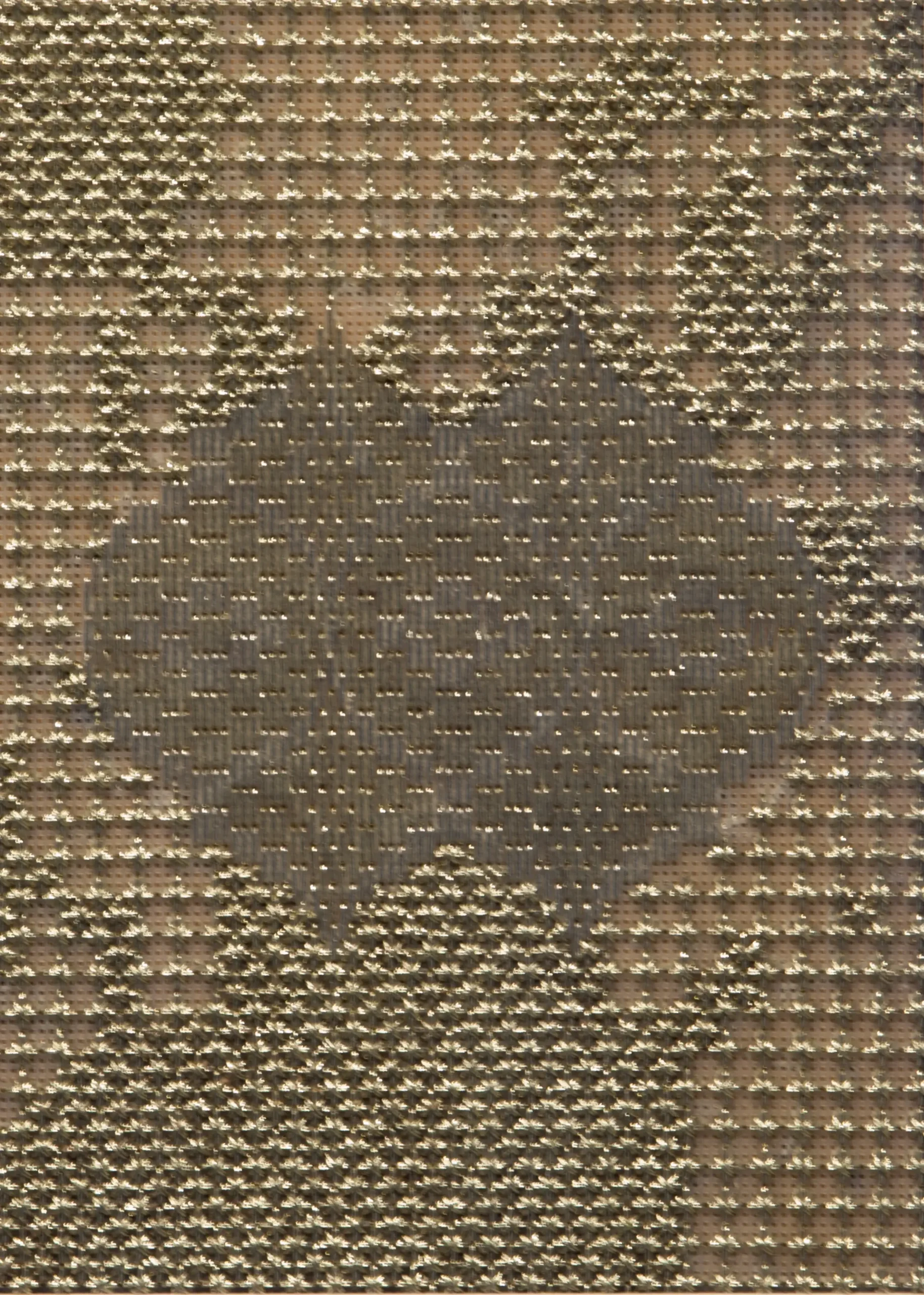 In an initial phase, Aurora used goldwork embroidery and golden threads to highlight period garments through the negative. The silhouettes of these garments were portrayed by the artist to question what were understood as “good customs,” through clothing that sought to constrain and reflect socially accepted values. In the current exhibition, delving deeper into the same theme, she moves away from figuration to give way to patterns.